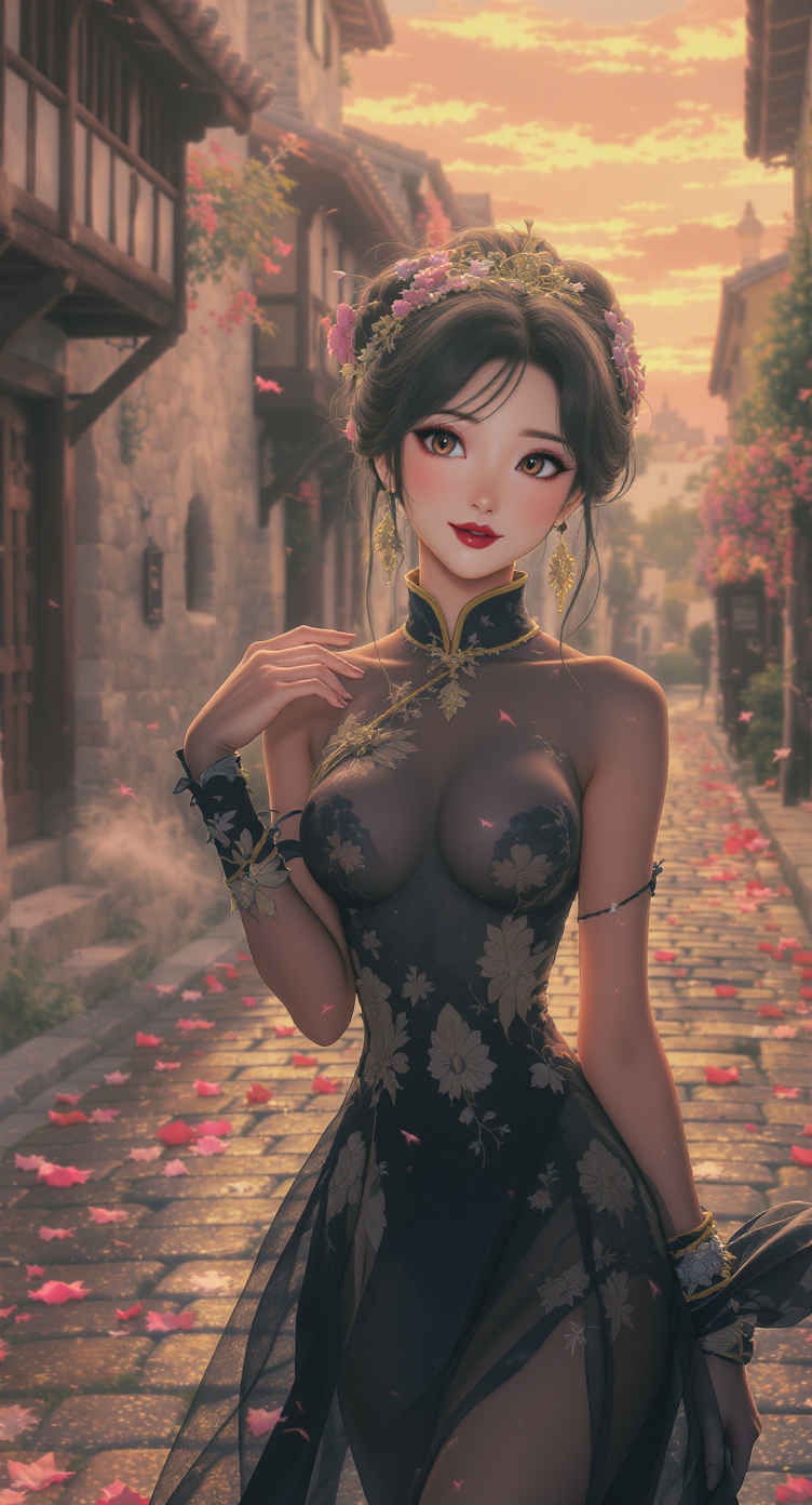 Ghibli studio style, Hayao Miyazaki art, of a beautiful Asian woman in a sheer black qipao, standing on a cobblestone street in a serene medieval town. The scene is bathed in the soft light of sunset. The look is teasing and sensual, but with the elegant and whimsical aesthetic characteristic of Ghibli films. Masterpiece, best quality, vibrant colors.
